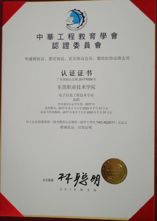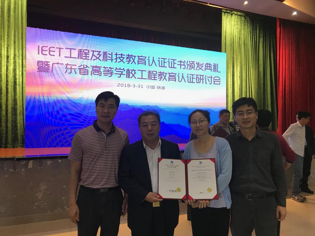 3月31日,IEET( Institute of Engineering Education Taiwan)工程及科技教育认证证书颁发典礼暨广东省高等学校工程教育认证研讨会在北京理工大学珠海学院举行,我院李奎山副院长带队参加了证书颁发典礼并代表我院领取了电子信息工程技术专业认证证书。在本次证书颁发典礼中,共有全省首批来自19所高等院校的25个专业通过了IEET工程及科技教育认证。至此,我院电子信息工程技术专业正式成为了广东省首批通过IEET工程及科技教育认证的专业之一,认证有效期为三年。